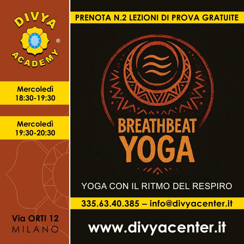 Mercoledì 18:30-19:30 e 19:30-20:30 ........................................................................... YOGA CON IL RITMO DEL RESPIRO .......................................................................... ............................ PRENOTA N.2 LEZIONI DI PROVA GRATUITE ............................... info & prenotazioni > mobile: 335.6340385 – mail: info@divyacenter.it ......................... .......................................................................................................................................... Yoga con il ritmo del respiro c/o DIVYA ACADEMY Via Orti 12 Milano M3 P.ta Romana